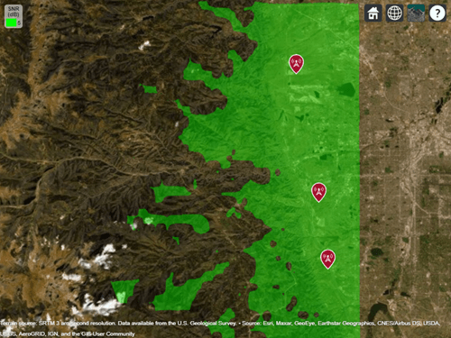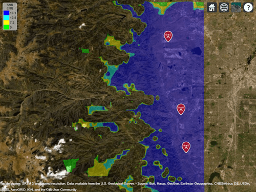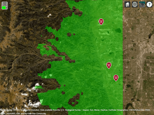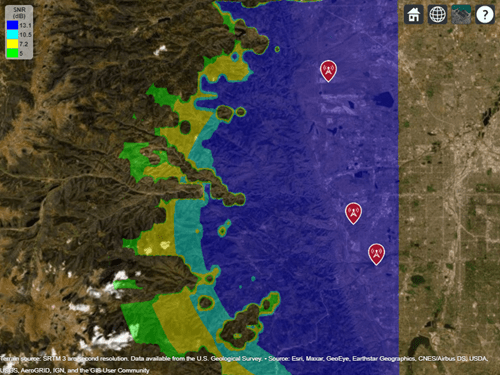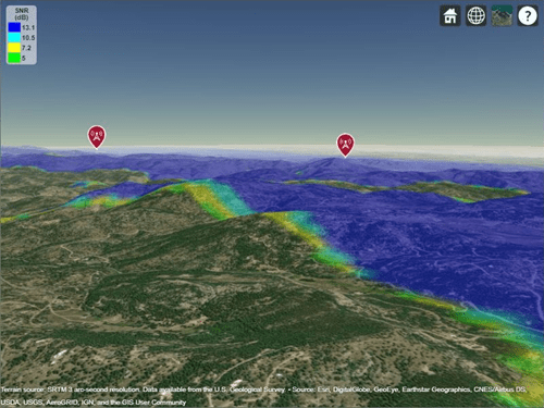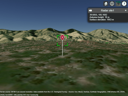 Zoom and rotate the map to view the 3-D terrain around the candidate radar sites. Select a site to view the location, antenna height, and ground elevation.