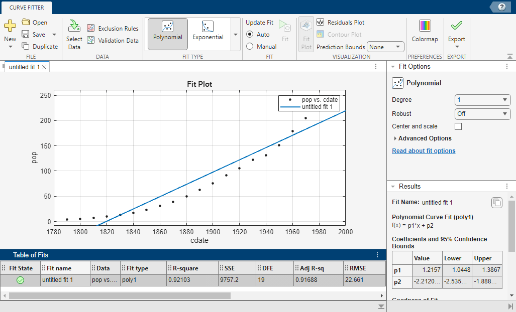In the app, select the data variables for the fit. On the Curve Fitter tab, in the Data section, click Select Data. In the Select Fitting Data dialog box, select cdate as the X data value and pop as the Y data value.