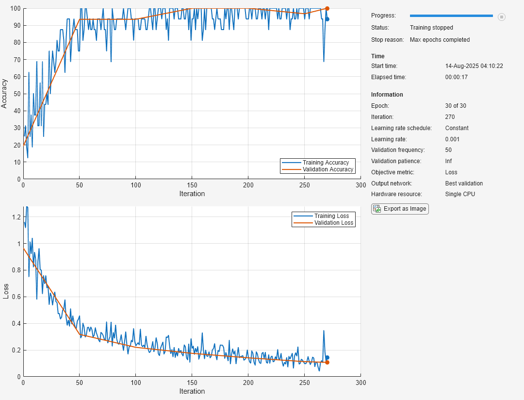 The training progress plot shows the mini-batch loss and accuracy and the validation loss and accuracy. For more information on the training progress plot, see Monitor Deep Learning Training Progress.