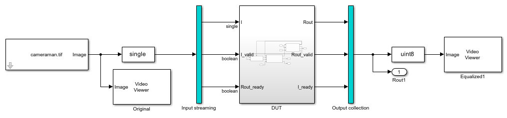 hdl.iteratorfunfunction. For example, you can usehdl.iteratorfunin a MATLAB Function block in your DUT to loop over arrays to produce a single output to an incoming image or matrix for histogram equalization and to compute statistics such asminandmax.Element-wise operations by using element-wise functions or blocks such as the Gain, Product, Sum, Subtract, and Divide blocks.