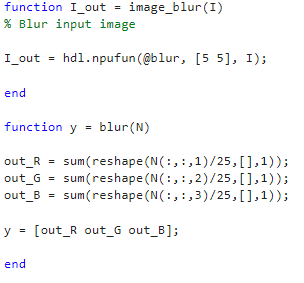 The DUT contains a MATLAB function called image_blur in the MATLAB Function block. The image_blur function calls the frame-to-sample supported function hdl.npufun that applies the blurring kernel in the blur function to the input image. For more information, see hdl.npufun.
