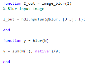 hdl.npufunfunction in a MATLAB function or the Neighborhood Processing Subsystem block in a Simulink model. You can usehdl.npufunin a MATLAB Function block in your DUT to apply neighborhood processing and element-wise operations to an incoming image or matrix, such as filtering with a kernel.Iterative operations using the