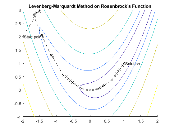 The following figure shows the iterations of the Levenberg-Marquardt method when minimizing Rosenbrock's function, a notoriously difficult minimization problem that is in least-squares form.