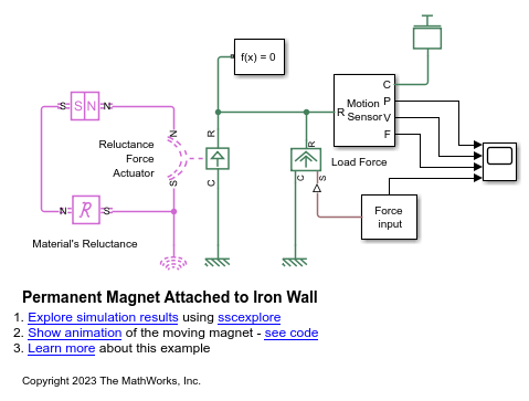 This example shows how to model the forces acting on a magnet that is attached to an iron wall. You can define the interaction between the magnetic and translational motion domains using a Permanent Magnet block and a Reluctance Force Actuator block.