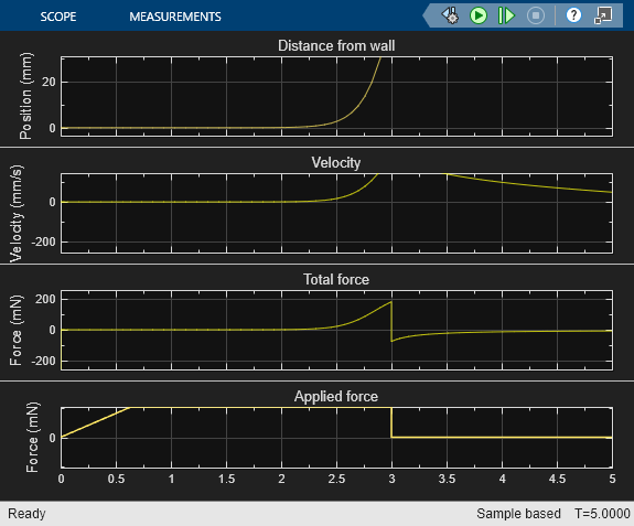When you start the simulation, the magnet touches the wall. The Force Input block gradually increases the force on the magnet so the magnet detaches from the wall. After, the force on the magnet exceeds the critical force, the Force Input Block stops raising the applied force to prevent the magnet from moving too far from the wall. At the simulation time of 3 seconds, the Force Input block stops applying the external force causing the magnet to reattach to the wall.