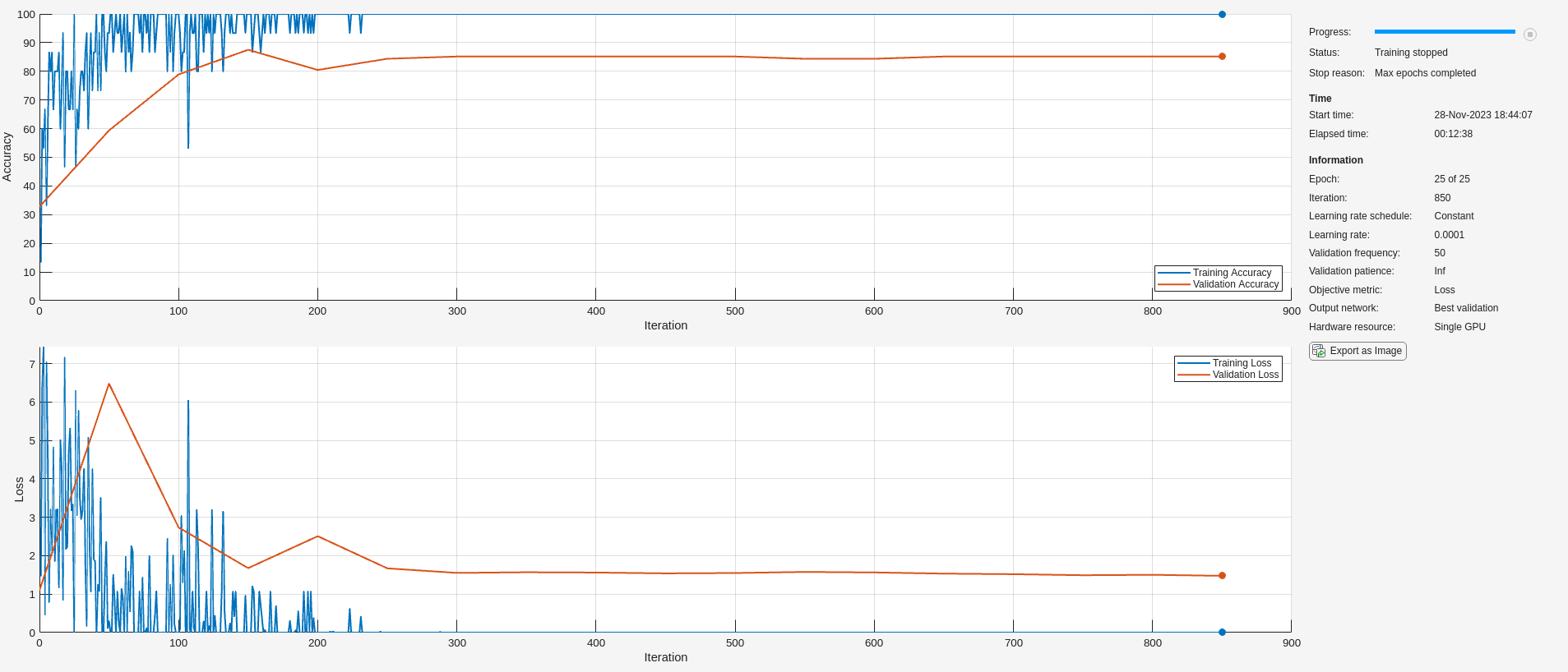 options = trainingOptions('sgdm', ... 'InitialLearnRate',1e-4, ... 'LearnRateDropPeriod',18, ... 'MiniBatchSize',15, ... 'MaxEpochs',25, ... 'L2Regularization',1e-1, ... 'Plots','training-progress', ... 'Metrics','accuracy', ... 'Verbose',false, ... 'Shuffle','every-epoch', ... 'ExecutionEnvironment','auto', ... 'ValidationData',{Xvalid,validationLabels});