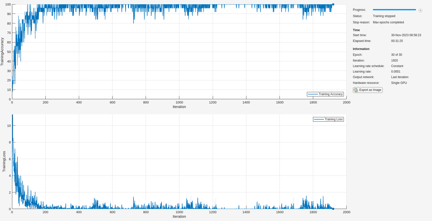 miniBatchSize = 25; options = trainingOptions('adam', ... 'InitialLearnRate',1e-4, ... 'MaxEpochs',30, ... 'MiniBatchSize',miniBatchSize, ... 'Shuffle','every-epoch', ... 'Plots', 'training-progress',... 'Metrics','accuracy', ... 'Verbose',false,... 'ExecutionEnvironment','gpu');