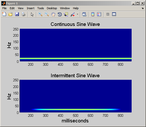 By using the STFT, you can see that the intermittent sine wave begins near 250 msec and ends around 750 msec. Additionally, you can see that the signal's energy is concentrated around 20 Hz.
