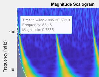To see the time, frequency, and magnitude of a scalogram point, enable data tips in the figure axes toolbar and click the desired point in the scalogram.