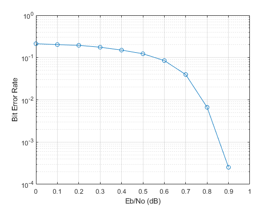 The plot below shows the results of the BER measurement with bitsPerEbNo = 1e8.