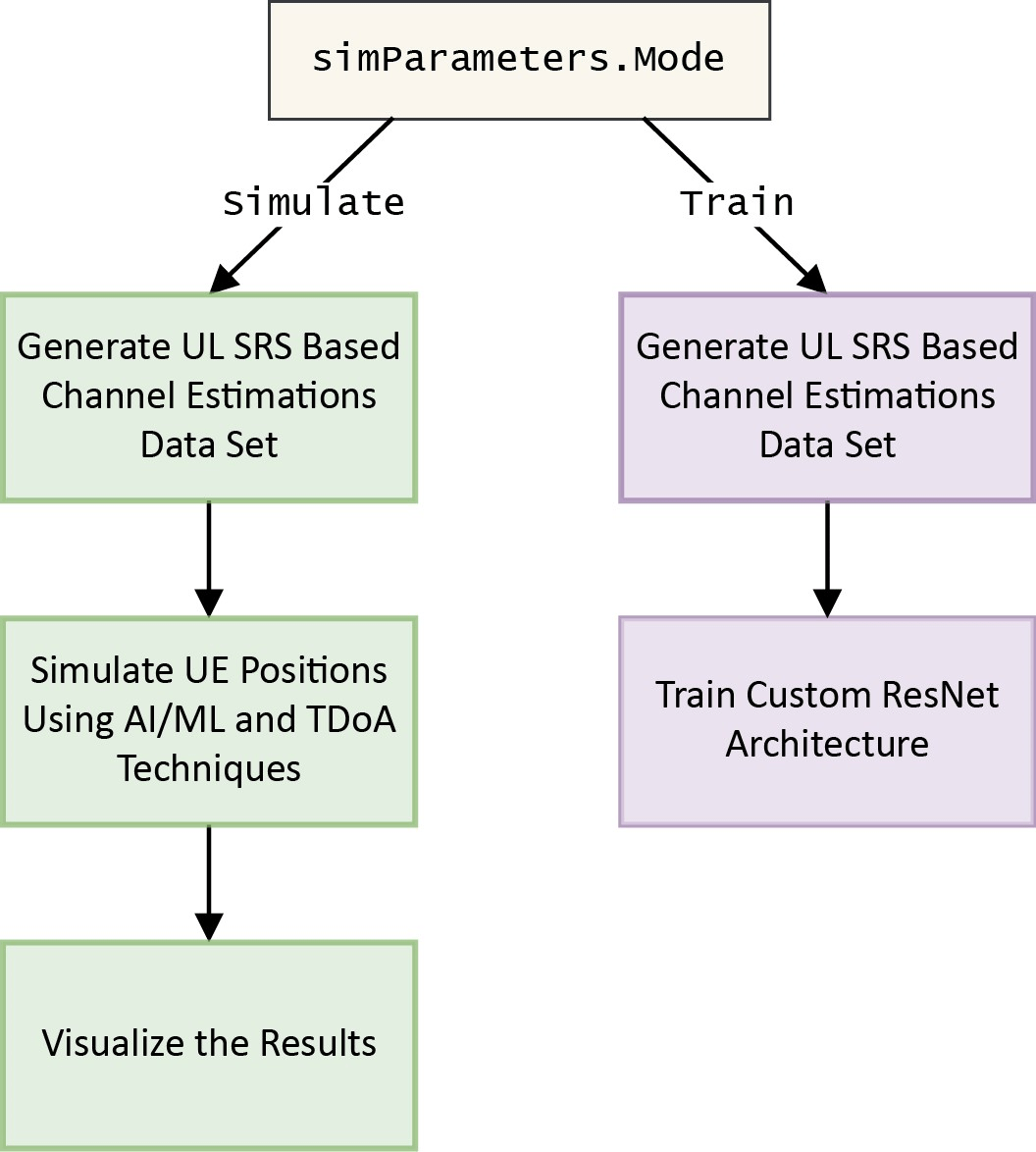 • Run the example in simulation mode (when simParameters.Mode is set to Simulate) to configure the propagation channels for positioning simulations to estimate 2D UE positions using a pretrained AI/ML network and conventional TDoA methods.