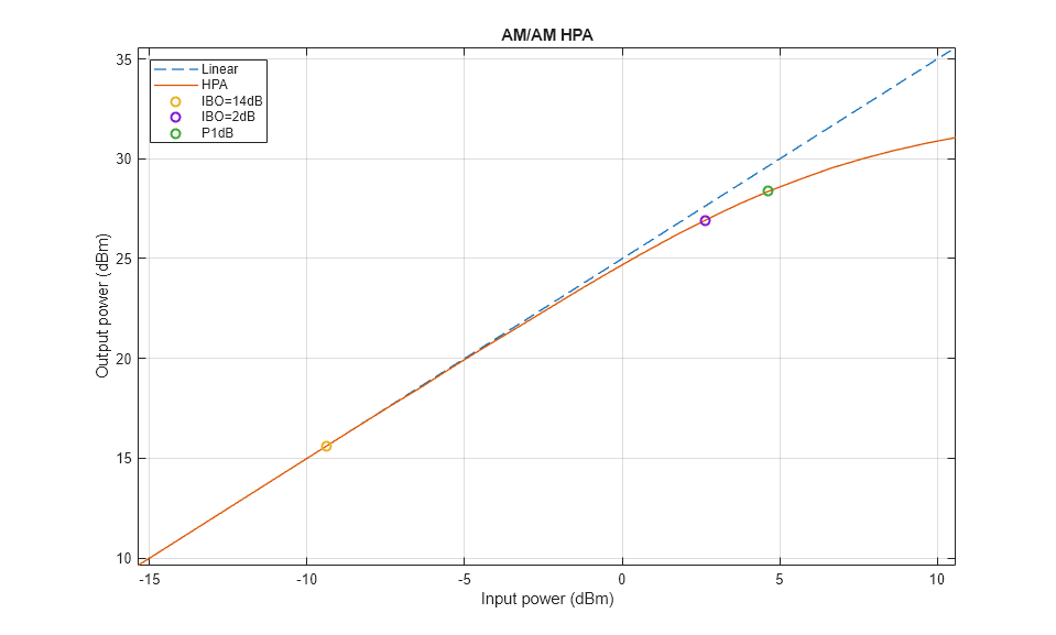 To characterize the impact of HPA nonlinearities in the EVM and ACLR evaluations, you can measure the amplitude-to-amplitude modulation (AM/AM) of the HPA. The AM/AM refers to the output power levels in terms of the input power levels. The local function hPlotHPACurve displays the AM/AM characteristic of the HPA selected for this model.