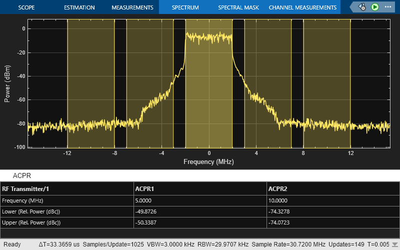 The Spectrum Analyzer block provides frequency-domain measurements such as ACLR (inverse of ACPR).