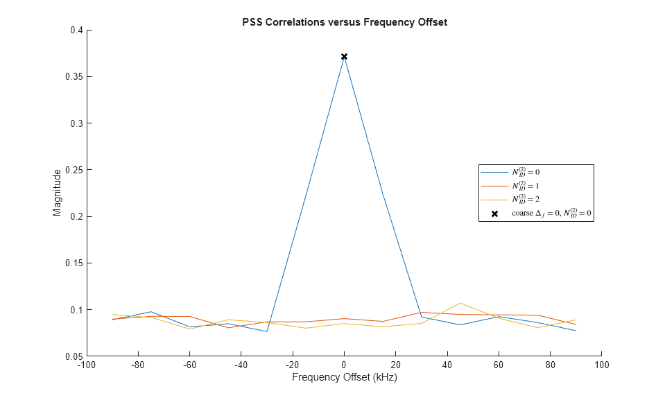searchBWto control the frequency offset search bandwidth.Correlate the frequency-shifted received waveform with each of the three possible PSS sequences (NID2) and extract the strongest correlation peak. The reference PSS sequences are centered in frequency. Therefore, the strongest correlation peak provides a measure of coarse frequency offset with respect to the center frequency of the carrier. The peak also indicates which of the three PSS (NID2) has been detected in the received waveform and the time instant of the best channel conditions.
