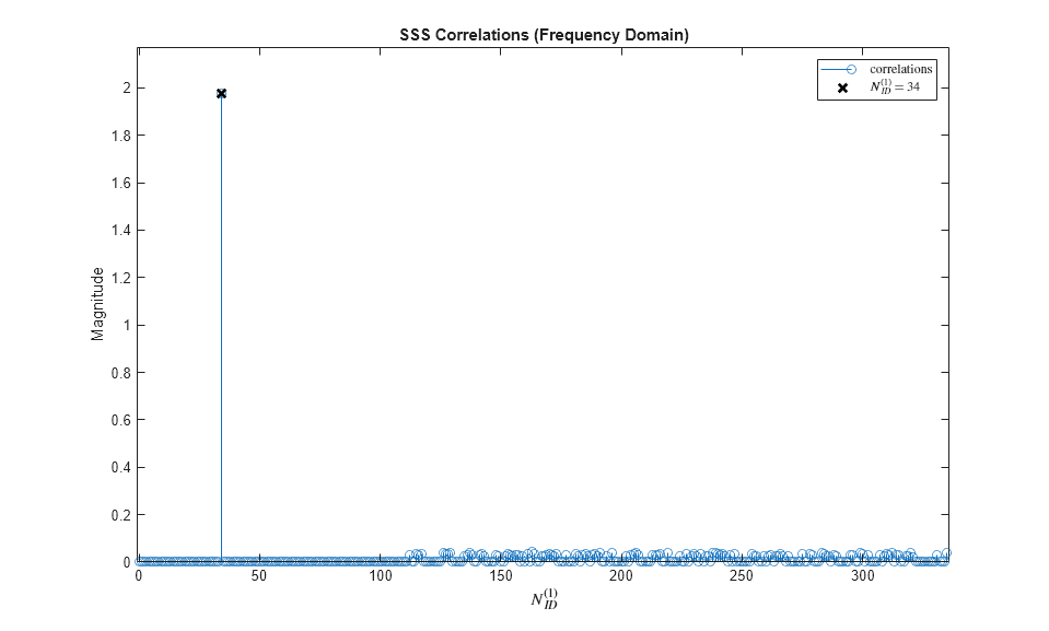 % Extract the received SSS symbols from the SS/PBCH block sssIndices = nrSSSIndices; sssRx = nrExtractResources(sssIndices,rxGrid); % Correlate received SSS symbols with each possible SSS sequence sssEst = zeros(1,336); for NID1 = 0:335 ncellid = (3*NID1) + NID2; sssRef = nrSSS(ncellid); sssEst(NID1+1) = sum(abs(mean(sssRx .* conj(sssRef),1)).^2); end % Plot SSS correlations figure; stem(0:335,sssEst,'o'); title('SSS Correlations (Frequency Domain)'); xlabel('$N_{ID}^{(1)}$','Interpreter','latex'); ylabel('Magnitude'); axis([-1 336 0 max(sssEst)*1.1]); % Determine NID1 by finding the strongest correlation NID1 = find(sssEst==max(sssEst)) - 1; % Plot selected NID1 hold on; plot(NID1,max(sssEst),'kx','LineWidth',2,'MarkerSize',8); legend(["correlations" "$N_{ID}^{(1)}$ = " + num2str(NID1)],'Interpreter','latex'); % Form overall cell identity from estimated NID1 and NID2 ncellid = (3*NID1) + NID2; disp([' Cell identity: ' num2str(ncellid)])