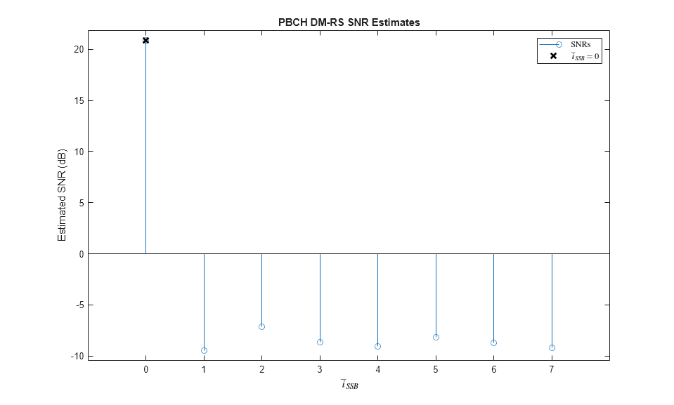 % Calculate PBCH DM-RS indices dmrsIndices = nrPBCHDMRSIndices(ncellid); % Perform channel estimation using DM-RS symbols for each possible DM-RS % sequence and estimate the SNR dmrsEst = zeros(1,8); for ibar_SSB = 0:7 refGrid = zeros([240 4]); refGrid(dmrsIndices) = nrPBCHDMRS(ncellid,ibar_SSB); [hest,nest] = nrChannelEstimate(rxGrid,refGrid,'AveragingWindow',[0 1]); dmrsEst(ibar_SSB+1) = 10*log10(mean(abs(hest(:).^2)) / nest); end % Plot PBCH DM-RS SNRs figure; stem(0:7,dmrsEst,'o'); title('PBCH DM-RS SNR Estimates'); xlabel('$\overline{i}_{SSB}$','Interpreter','latex'); xticks(0:7); ylabel('Estimated SNR (dB)'); axis([-1 8 min(dmrsEst)-1 max(dmrsEst)+1]); % Record ibar_SSB for the highest SNR ibar_SSB = find(dmrsEst==max(dmrsEst)) - 1; % Plot selected ibar_SSB hold on; plot(ibar_SSB,max(dmrsEst),'kx','LineWidth',2,'MarkerSize',8); legend(["SNRs" "$\overline{i}_{SSB}$ = " + num2str(ibar_SSB)],'Interpreter','latex');