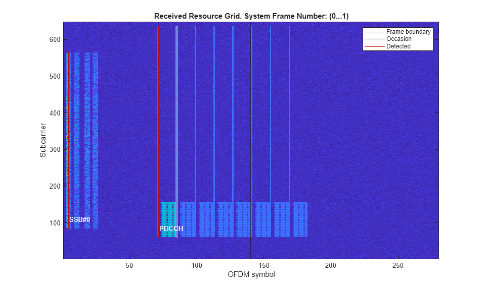 [frameOffset,nLeadingFrames] = hTimingOffsetToFirstFrame(timingOffset,refBurst,ssbIndex,nHalfFrame,sampleRate); % Add leading zeros zeroPadding = zeros(-min(frameOffset,0),size(rxWave,2)); rxWave = [zeroPadding; rxWave(1+max(frameOffset,0):end,:)]; % Determine the number of resource blocks and subcarrier spacing for OFDM % demodulation of CORESET 0. nrb = hCORESET0DemodulationBandwidth(initialSystemInfo,scsSSB,minChannelBW); if sampleRate < nrb*12*scsCommon*1e3 disp(['SIB1 recovery cannot continue. CORESET 0 resources are beyond '... 'the frequency limits of the received waveform for the sampling rate configured.']); return; end % OFDM demodulate received waveform with common subcarrier spacing nSlot = 0; rxGrid = nrOFDMDemodulate(rxWave, nrb, scsCommon, nSlot,... 'SampleRate',sampleRate,'CarrierFrequency',fPhaseComp); % Display OFDM resource grid and highlight strongest SS block plotResourceGrid(rxGrid,refBurst,initialSystemInfo,nLeadingFrames,ssbIndex,nHalfFrame)
