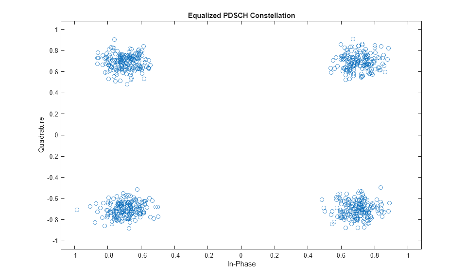 disp(' -- PBCH demodulation and BCH decoding -- ') % Extract the received PBCH symbols from the SS/PBCH block [pbchIndices,pbchIndicesInfo] = nrPBCHIndices(ncellid); pbchRx = nrExtractResources(pbchIndices,rxGrid); % Configure 'v' for PBCH scrambling according to TS 38.211 Section 7.3.3.1 % 'v' is also the 2 LSBs of the SS/PBCH block index for L_max=4, or the 3 % LSBs for L_max=8 or 64. if refBurst.L_max == 4 v = mod(ibar_SSB,4); else v = ibar_SSB; end ssbIndex = v; % PBCH equalization and CSI calculation pbchHest = nrExtractResources(pbchIndices,hest); [pbchEq,csi] = nrEqualizeMMSE(pbchRx,pbchHest,nVar); Qm = pbchIndicesInfo.G / pbchIndicesInfo.Gd; csi = repmat(csi.',Qm,1); csi = reshape(csi,[],1); % Plot received PBCH constellation after equalization figure; plot(pbchEq,'o'); xlabel('In-Phase'); ylabel('Quadrature') title('Equalized PBCH Constellation'); m = max(abs([real(pbchEq(:)); imag(pbchEq(:))])) * 1.1; axis([-m m -m m]); % PBCH demodulation pbchBits = nrPBCHDecode(pbchEq,ncellid,v,nVar); % Calculate RMS PBCH EVM in % pbchRef = nrPBCH(pbchBits<0,ncellid,v); pbchEVMrms = nrEVM(pbchEq,pbchRef)*100; % Display calculated EVM disp([' PBCH RMS EVM: ' num2str(pbchEVMrms,'%0.3f') '%']);