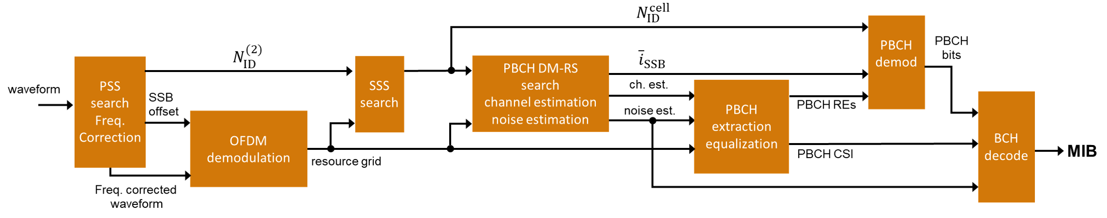 Receiver: Apply various synchronization and demodulation processes to the received waveform to establish the system frame number, cell identity and SSB, and decode the MIB. These provide the information required for blind decoding of downlink control information (DCI) in a PDCCH. The receiver uses DCI to configure the PDSCH demodulator, decode DL-SCH and finally recover the SIB1.