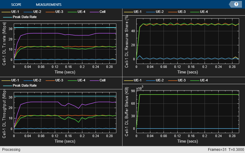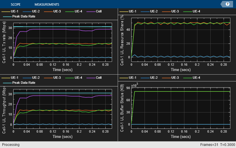 Peak UL throughput: 31.11 Mbps. Achieved cell UL throughput: 27.62 Mbps Achieved UL throughput for each UE: [0.23 0.23 13.9 13.26] Peak UL spectral efficiency: 6.22 bits/s/Hz. Achieved UL spectral efficiency for cell: 5.52 bits/s/Hz Block error rate for each UE in the UL direction: [0 0 0 0] Peak DL throughput: 31.11 Mbps. Achieved cell DL throughput: 24.06 Mbps Achieved DL throughput for each UE: [0.18 0.19 12.47 11.22] Peak DL spectral efficiency: 6.22 bits/s/Hz. Achieved DL spectral efficiency for cell: 4.81 bits/s/Hz Block error rate for each UE in the DL direction: [0.056 0 0 0.04]