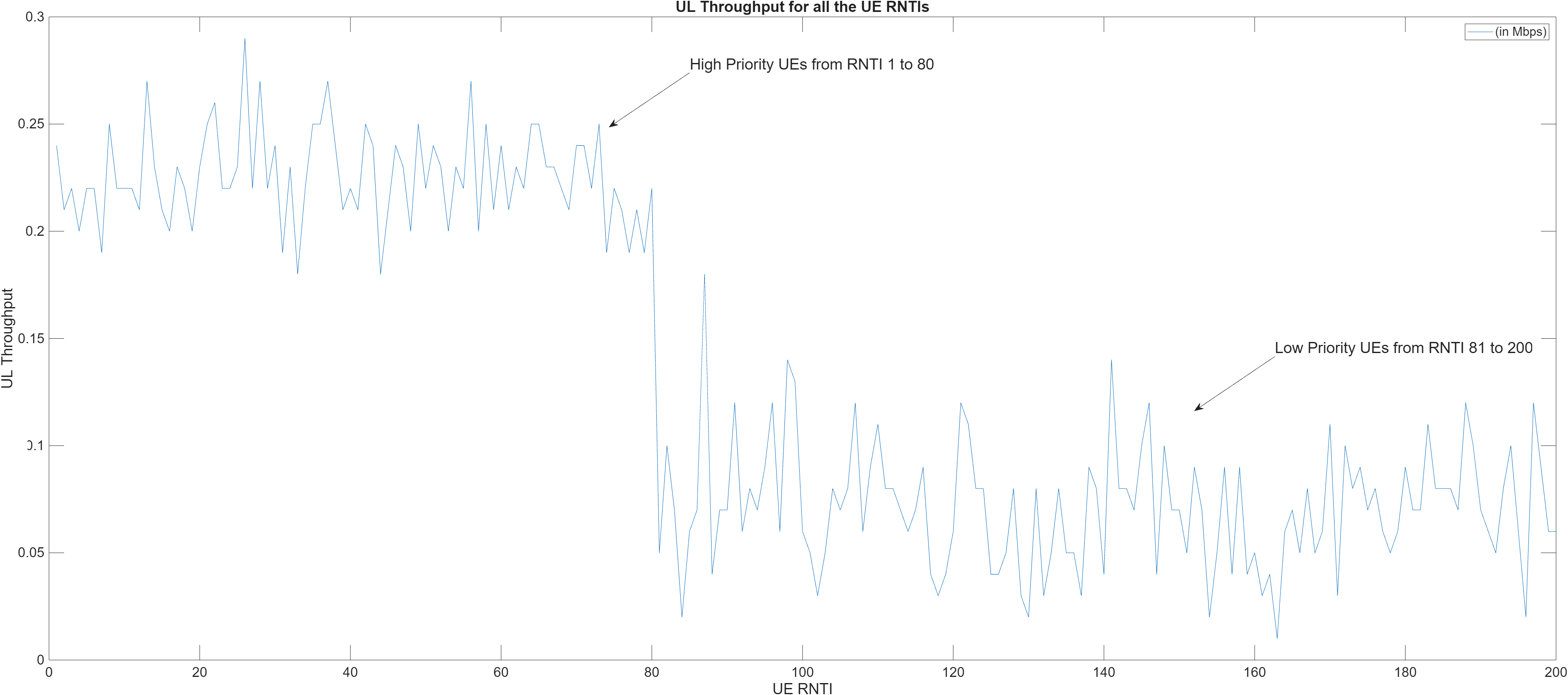 For instance, this plot illustrates the UL throughput using the implemented custom scheduling strategy for 200 UE nodes distributed within a 100-meter distance from the gNB. The first 80 UEs have high-priority, while the remaining UEs are low-priority. The SRS transmission periodicity of all the UE nodes is set to 80 slots. All other configurations remain the same as in this example script.