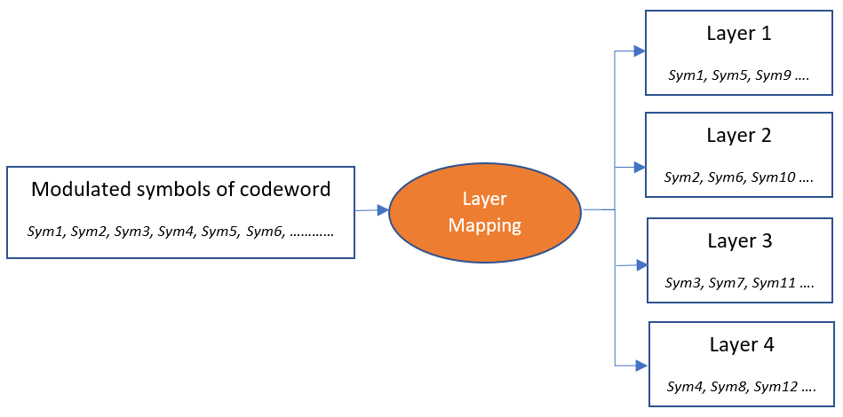 Spatial multiplexing utilizes MIMO to perform multi-layer transmission. The minimum of number of transmit and receive antennas limits the number of layers (or maximum rank). The layer mapping process maps the modulated symbols of the codeword onto different layers. It maps every symbol of the codeword to layer. For instance, this figure shows the mapping of a codeword onto four layers.