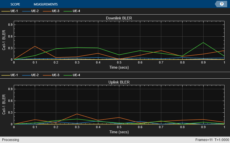 Peak UL throughput: 124.42 Mbps. Achieved cell UL throughput: 70.57 Mbps Achieved UL throughput for each UE: [28.12 25.12 12.9 4.44] Peak UL spectral efficiency: 24.88 bits/s/Hz. Achieved UL spectral efficiency for cell: 14.11 bits/s/Hz Block error rate for each UE in the UL direction: [0 0.028 0.105 0.05] Peak DL throughput: 124.42 Mbps. Achieved cell DL throughput: 74.67 Mbps Achieved DL throughput for each UE: [25.42 24.26 17 8] Peak DL spectral efficiency: 24.88 bits/s/Hz. Achieved DL spectral efficiency for cell: 14.93 bits/s/Hz Block error rate for each UE in the DL direction: [0.003 0.034 0.142 0.212]