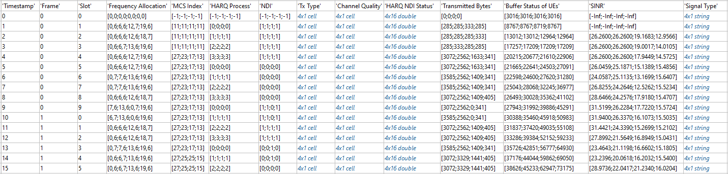 SINR: Column vector of length N, where N represents the number of UE nodes. The values denote the effective signal to interference plus noise ratio received at the gNB or UE node. An SINR value of -Inf indicates that the simulator did not log the value at a particular slot.
