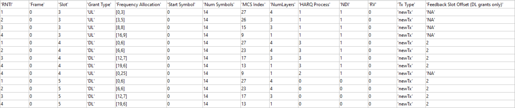 Frequency Allocation: N-by-P matrix. N is the number of UEs. For frequency resource allocation type-1, P is 2. The first element of frequency resource allocation indicates the starting RB. The second element indicates the number of RBs allocated. For example, [0,6;6,6;12,7;19,6] indicates this: the scheduler has assigned 6 RBs (starting from 0) to UE-1, 6 RBs (starting from 6) to UE-2, 7 RBs (starting from 12) to UE-3, and 6 RBs (starting from 19) to UE-4. For frequency resource allocation type-0, P is the number of resource block groups (RBGs). The scheduler assigns an RBG to a particular UE by setting the corresponding bit to 1. For example, [ 0 0 1 1 0 1 0 1 0 1 0 0 0; 1 1 0 0 0 0 0 0 0 0 1 0 0; 0 0 0 0 1 0 1 0 1 0 0 1 1; 0 0 0 0 0 0 0 0 0 0 0 0 0] indicates that the bandwidth has 13 RBGs. The scheduler has assigned the RBG indices 2, 3, 5, 7, and 9 to UE-1, the RBG indices 0, 1, and 10 to UE-2, and the RBG indices 4, 6, 8, 11, and 12 to UE-3. The scheduler has not assigned any RBGs to UE-4.