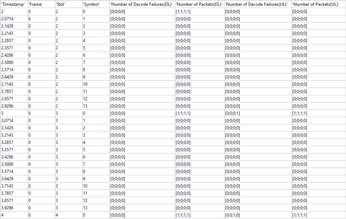 if enableTraces simulationLogs = cell(1,1); if gNB.DuplexMode == "FDD" logInfo = struct(DLTimeStepLogs=[],ULTimeStepLogs=[],... SchedulingAssignmentLogs=[],PhyReceptionLogs=[]); [logInfo.DLTimeStepLogs,logInfo.ULTimeStepLogs] = getSchedulingLogs(simSchedulingLogger); else % TDD logInfo = struct(TimeStepLogs=[],SchedulingAssignmentLogs=[],PhyReceptionLogs=[]); logInfo.TimeStepLogs = getSchedulingLogs(simSchedulingLogger); end % Obtain the scheduling assignments log logInfo.SchedulingAssignmentLogs = getGrantLogs(simSchedulingLogger); % Obtain the Phy reception logs logInfo.PhyReceptionLogs = getReceptionLogs(simPhyLogger); % Save simulation logs in a MAT-file simulationLogs{1} = logInfo; save(simulationLogFile,"simulationLogs") end