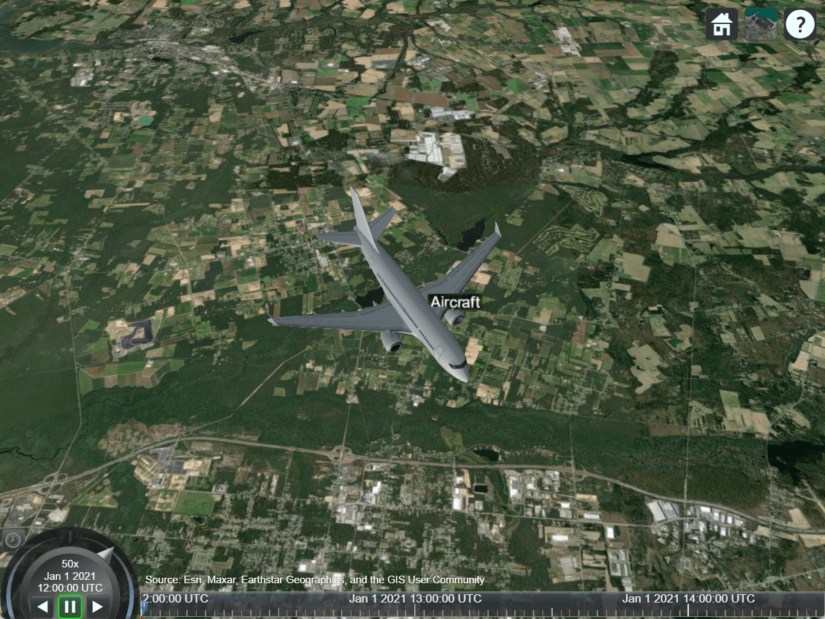 aircraft.obj = platform(mission.scenario,aircraft.trajectory, Name="Aircraft"); aircraft.obj.MarkerColor = "green"; hide(aircraft.obj.Path); show(aircraft.obj.GroundTrack); aircraft.obj.Visual3DModel = "NarrowBodyAirliner.glb"; camtarget(mission.viewer, aircraft.obj);