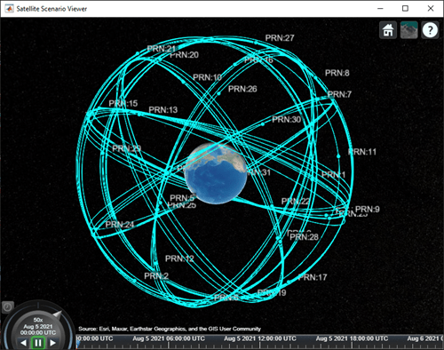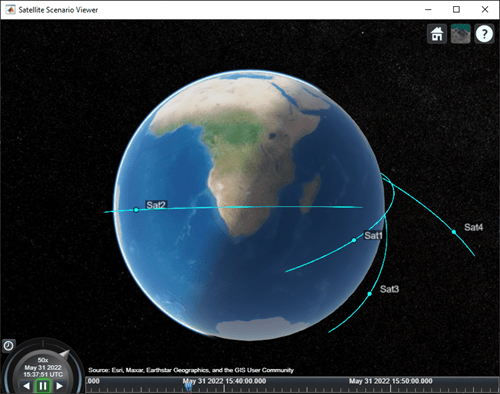 startTime = datetime(2020,6,02,8,23,0); stopTime = startTime + days(1); sampleTime = 60; sc = satelliteScenario(startTime,stopTime,sampleTime);
