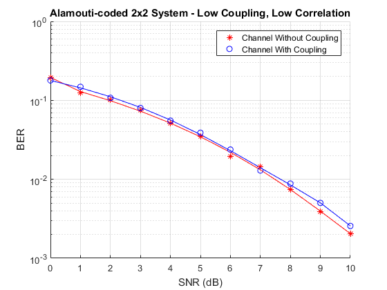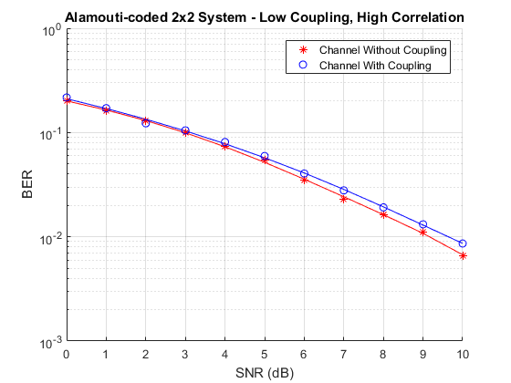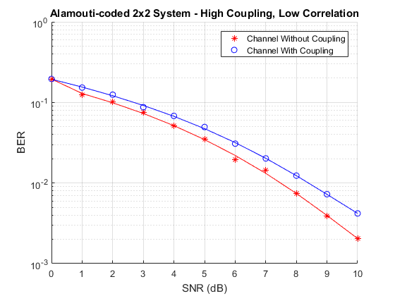 The effect of correlation and mutual coupling on the BER performance can be further studied by modifying the correlation coefficient and/or by changing the spacing between the elements. The smaller the spacing is, the higher the coupling is. Similar to what has been done in this example for high correlation (0.9) and high coupling (spacing = ) at Rx, the BER vs. SNR results for low correlation (0.1) and/or low coupling (spacing = ) are shown below.