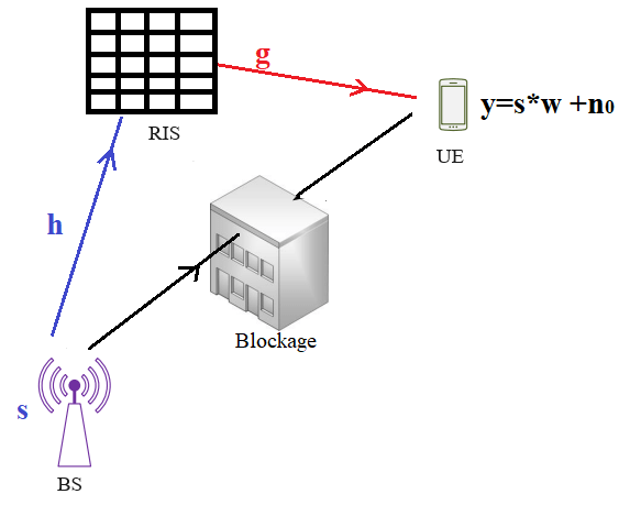 The inclusion of the RIS provides a two-segment indirect path to the signal traveling between the BS and the UE. The first segment covers the path between the BS and the RIS. The second segment covers the path between the RIS and the UE. The channel matrix of these two signal paths depends on the geometry and the electromagnetic reflection properties of the RIS.