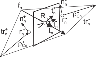 The basis function is zero outside the two adjacent triangles and . The RWG vector basis function is linear and has no flux (no normal component) through its boundary.