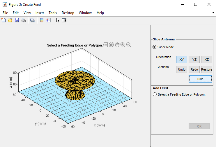 For complex 3-D antenna geometries, the feed could be set using UI figure window. To select the feeding edges, open the UI figure window using createFeed() function.