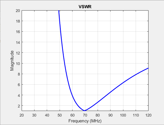 d = dipole; vswr(d,20e6:1e6:120e6,72) axis([20 120 1 20])