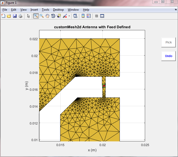 Use the customAntennaMesh object from the Antenna Toolbox to import the custom planar mesh from the saved MAT file. To convert this mesh to an antenna, a feed needs to be defined. This determines where the antenna is excited.