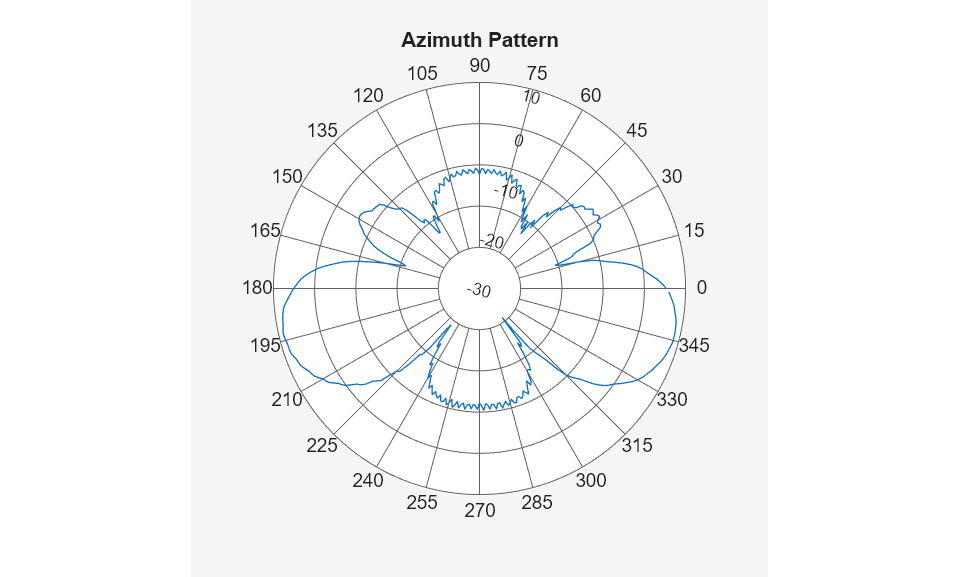 The transmit side comprises of a 4 element linear array of resonant dipoles spaced half-wavelength apart. There are 4 receiving antennas, resonant dipoles, placed in the far-field of this array. These 4 dipoles are placed in the azimuthal plane at 15 degrees, 45 degrees, 315 degrees and 345 degrees. The locations correspond to the expected beam peaks from the switched beam array output. The response at each of these far-field receiving antenna elements is computed as a superposition of the contributions from each antenna element in the 4-element transmit array. The channel is assumed to be free-space. To capture the interactions on the transmit side and the transfer function from the transmit to receive antennas, we compute the overall scattering parameters for the transmit-receive system. This is done by using the conformalArray in Antenna Toolbox. The resulting 8-port S-parameter matrix is loaded into the S-parameters block in RF Blockset. The first 4 ports correspond to the transmit side antenna elements and the ports 5-8 belong to the individual receiving antennas in the far-field.