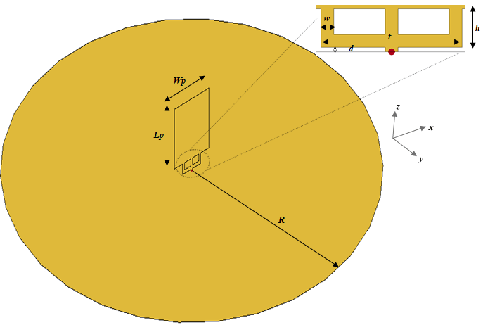 This figure shows the geometry and dimensions of an annular planar monopole antenna. The radiating element is an annular ring, with an outer radius (rBig) of 25 mm and an inner radius (rSmall) of 10 mm, located vertically above a square ground plane with a side length of 305 mm. The feed gap (d)between the feed point in the radiator and the ground plane and the width of the feed strip (w) are set to 0.8 mm and 0.6 mm, respectively, to enhance the impedance bandwidth. The offset value is set to 0.2 mm to make a perfect connection between the feed strip and the annular ring radiator.