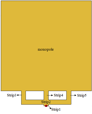 The radiator comprises of a trident-shaped feeding strip and square monopole. Create the trident-shaped feeding strip object, Feed, by adding the Strip1, Strip2, Strip3, Strip4 and Strip5 shapes. To create radiator, add the Feed with monopole shape.