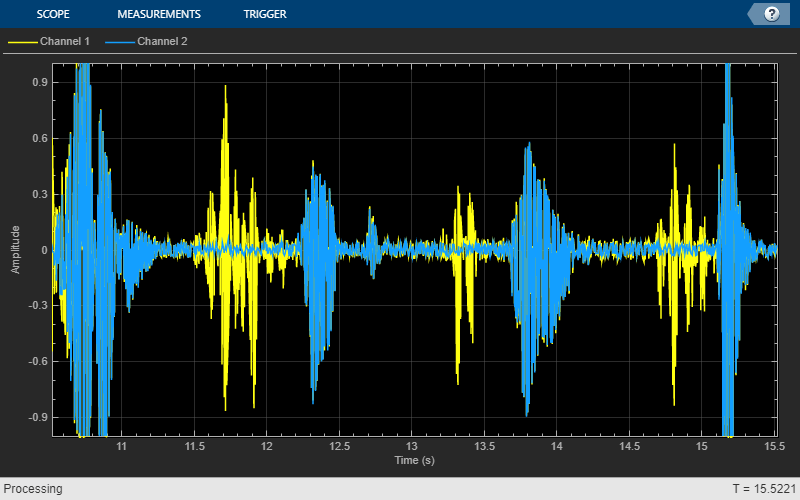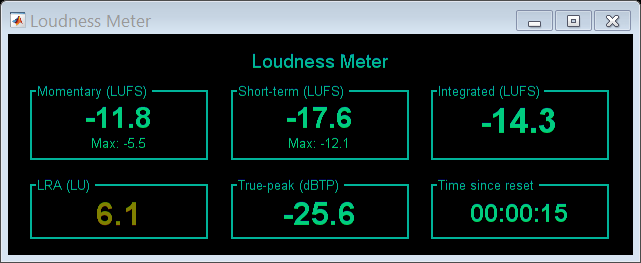 scope = timescope('SampleRate',sampleRate, ... 'TimeSpanSource','property', ... 'TimeSpanOverrunAction','scroll', ... 'TimeSpan',5, ... 'BufferLength',5*2*sampleRate, ... 'YLimits',[-1 1]); loudMtr = loudnessMeter('SampleRate',sampleRate); visualize(loudMtr) while ~isDone(fileReader) audioIn = fileReader(); controlSignal = osc(); setParameter(hostedPlugin,1,controlSignal(1)); stereoAudioIn = [audioIn,audioIn]; x = process(hostedPlugin,stereoAudioIn); loudMtr(x); scope([x(:,1),audioIn(:,1)]) deviceWriter(x); end