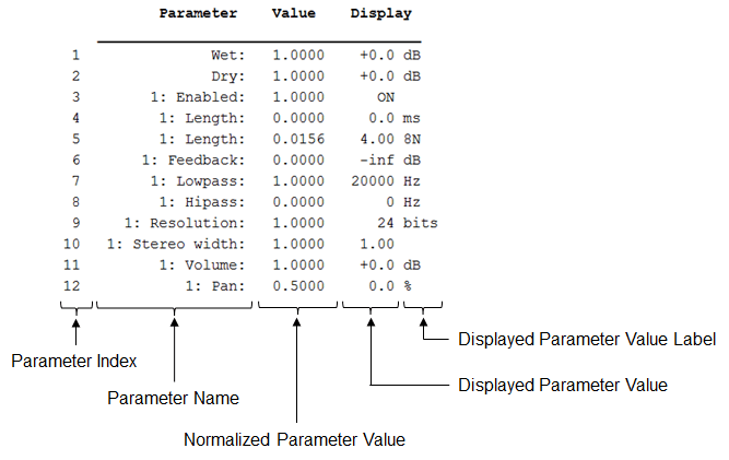 For example, the Wet parameter of readelay-standalone.dll has a normalized parameter value of 1 and a display parameter value of +0.0. The Wet parameter might be displayed in a DAW as follows: