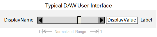 The normalized parameter value is always in the range [0,1] and generally corresponds to the position of a user interface (UI) widget in a DAW or the position of a MIDI control on a MIDI control surface. The parameter display value is related to the normalized parameter value by an unknown mapping internal to the plugin and typically reflects the value used internally by the plugin for processing.