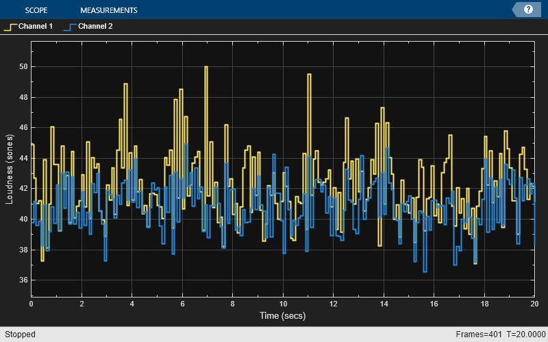 scope = timescope( ... 'SampleRate',1/frameDur, ... 'YLabel','Loudness (sones)', ... 'ShowGrid',true, ... 'PlotType','Stairs', ... 'TimeSpanSource','property', ... 'TimeSpan',20, ... 'AxesScaling','Auto', ... 'ShowLegend',true);