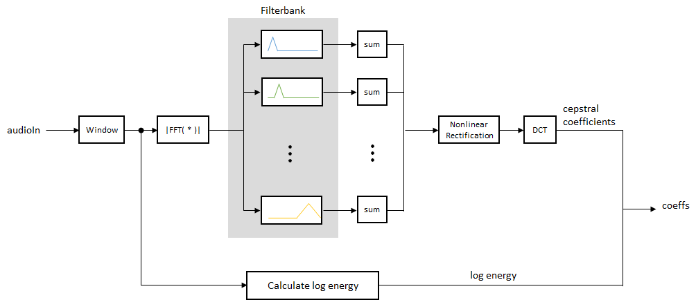 The Cepstral Feature Extractor block extracts cepstral features from an audio segment. Cepstral features are commonly used to characterize speech and music signals.