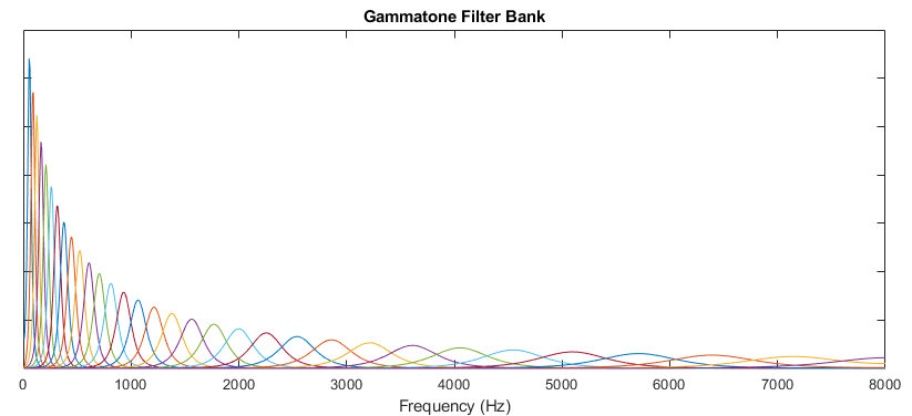 on the ERB scale between 50 and 8000 Hz. The filter bank is designed by gammatoneFilterBank.