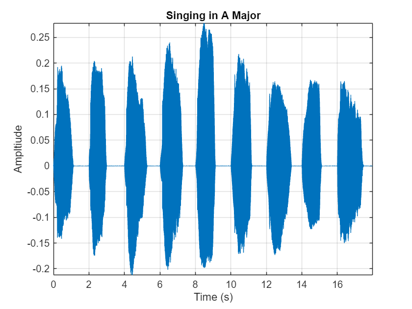 [audioIn,fs] = audioread('SingingAMajor-16-mono-18secs.ogg'); soundsc(audioIn,fs) T = 1/fs; t = 0:T:(length(audioIn)*T) - T; plot(t,audioIn); grid on axis tight xlabel('Time (s)') ylabel('Ampltiude') title('Singing in A Major')