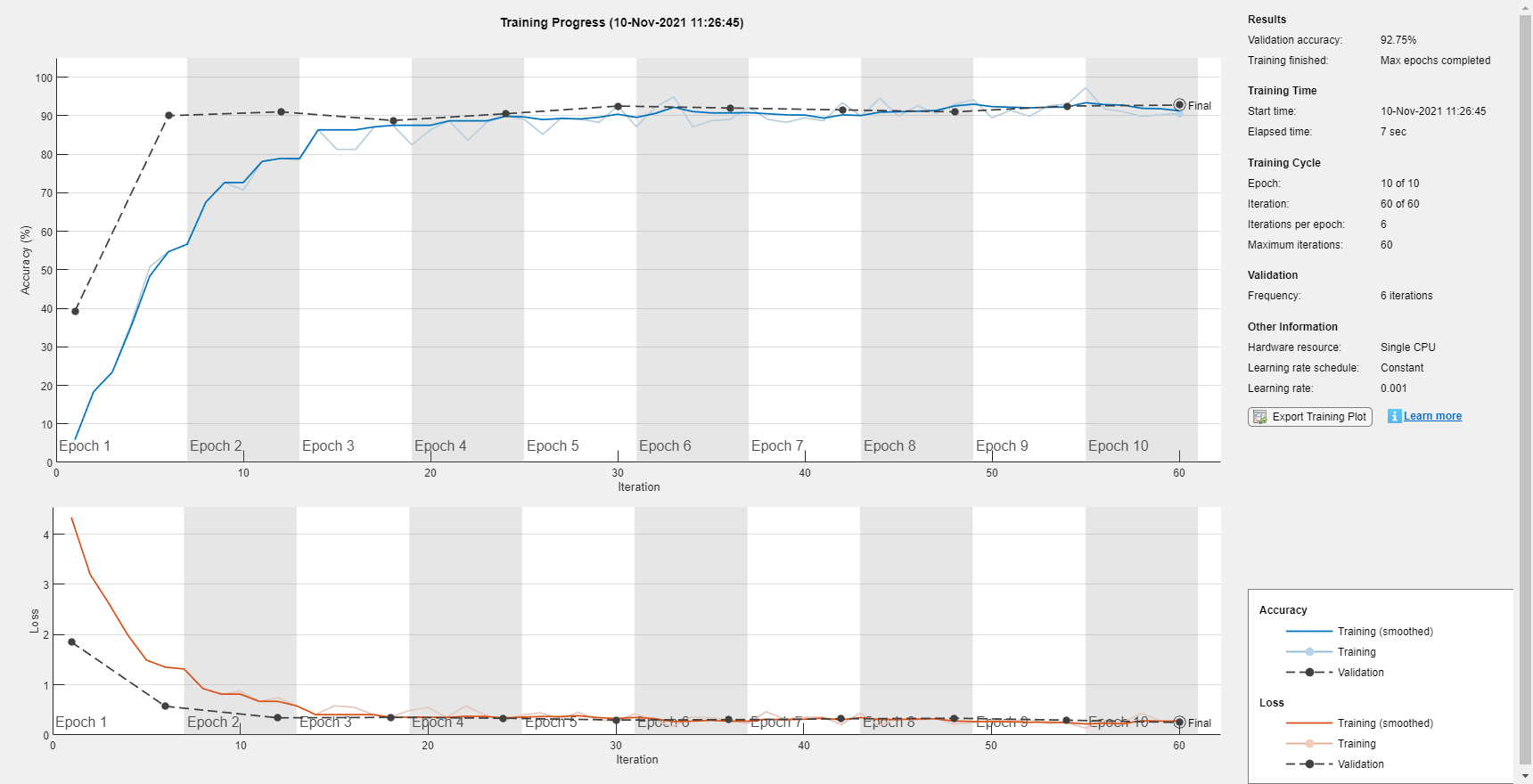 miniBatchSize = 256; validationFrequency = floor(numel(adsTrain.Labels)/miniBatchSize); options = trainingOptions("adam", ... MaxEpochs=10, ... MiniBatchSize=miniBatchSize, ... Plots="training-progress", ... Verbose=false, ... Shuffle="every-epoch", ... ValidationData={ivectorsValidation,adsValidation.Labels}, ... ValidationFrequency=validationFrequency);