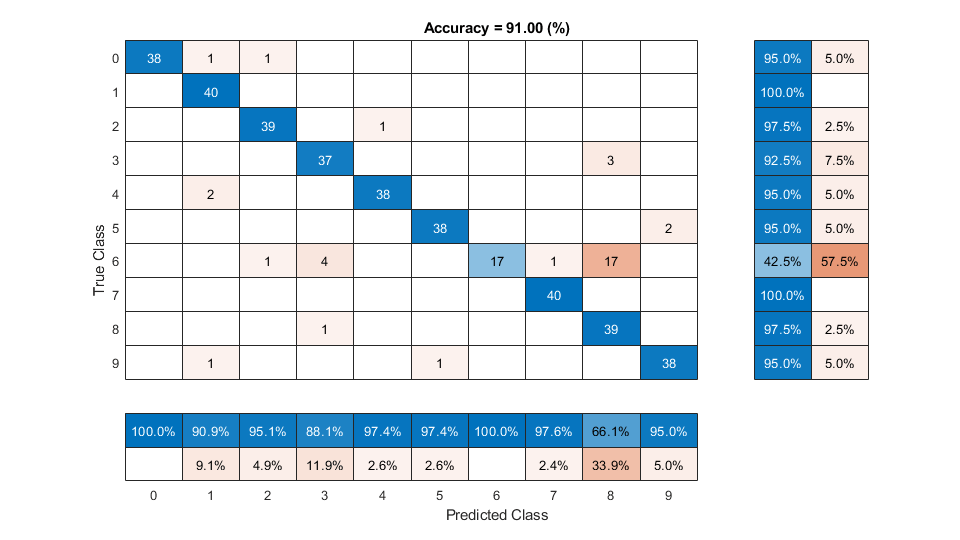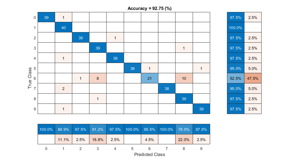 figure(Units="normalized",Position=[0.2 0.2 0.5 0.5]) confusionchart(trueLabels,predictedLabels, ... ColumnSummary="column-normalized", ... RowSummary="row-normalized", ... Title=sprintf('Accuracy = %0.2f (%%)',100*mean(predictedLabels==trueLabels)))